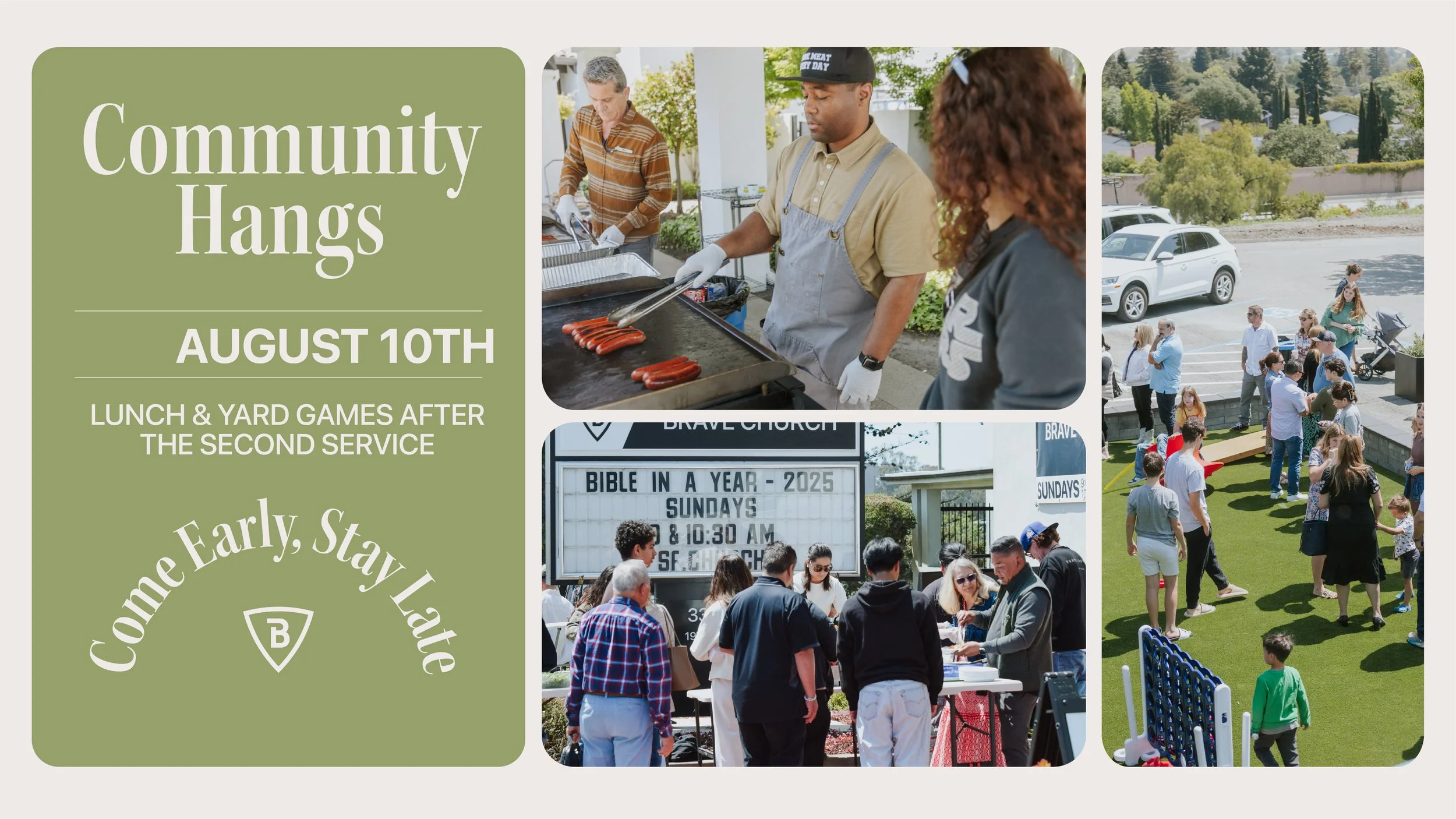 Join us after the second service for a community hang with lunch, fun activities, and great conversation. It’s the perfect chance to relax, connect with others, and build relationships with those at your campus. Whether you're new or have been around for a while, we’d love to see you there—come hungry and ready to have a good time!