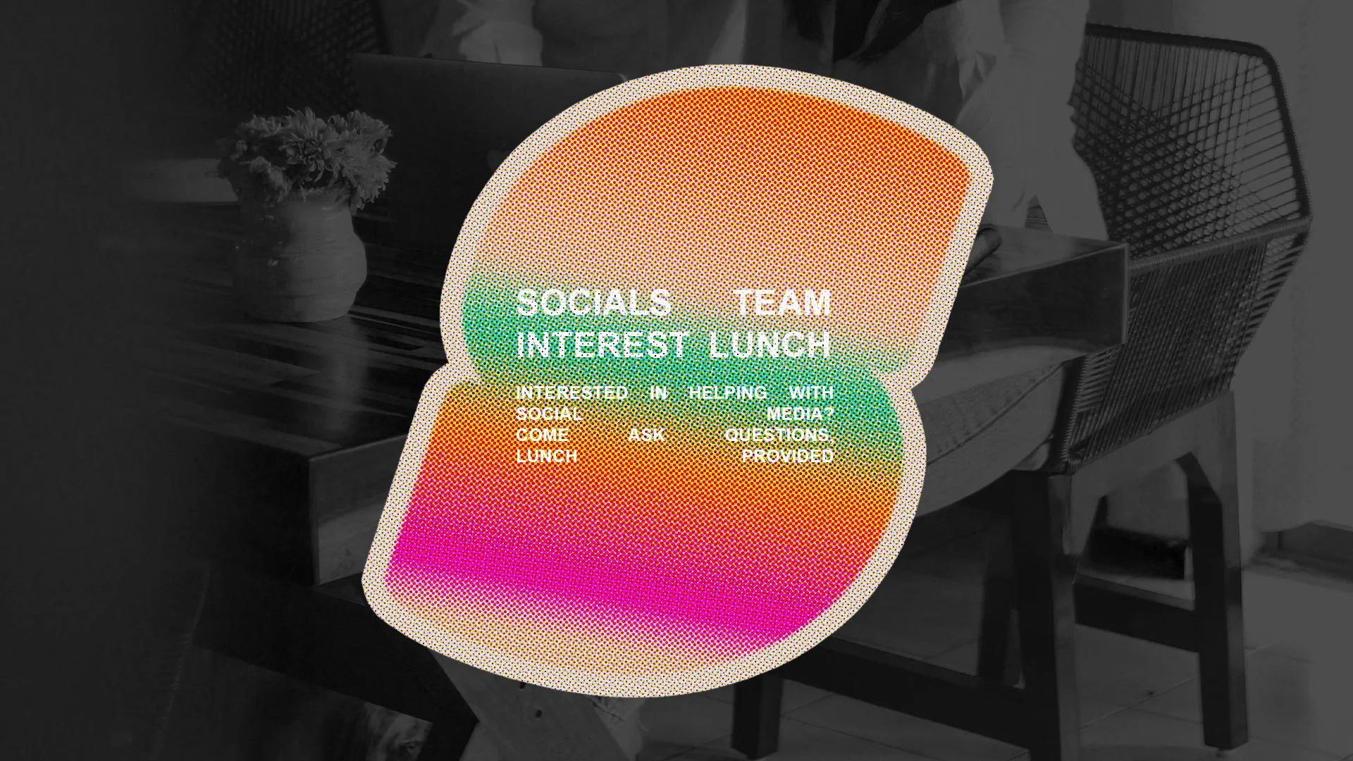 Whether you love creating content, capturing moments, or helping people stay connected through social media, this is a great chance to ask questions, meet new friends, and see how you can get involved. Lunch is on us — just come hang out and explore what being on the Socials Team looks like!