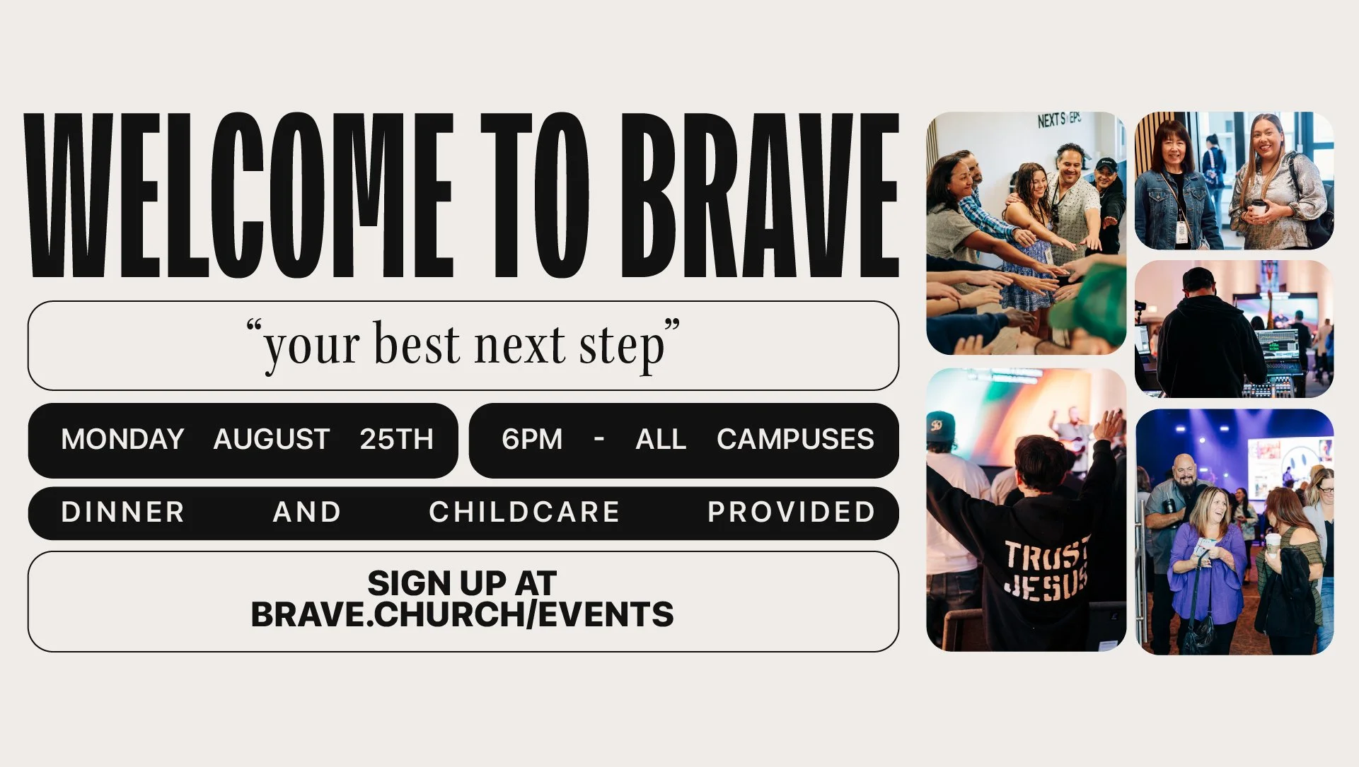 If you've recently decided to follow Jesus or joined Brave, Welcome to Brave is YOUR best next step! You’ll learn all about who we are as a church, who you are as an individual, and how you can make a difference in our community!